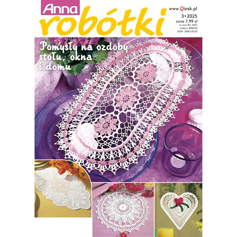 W numerze: zazdrostka z kwiatami, patchworkowa serwetka z kwadratowych filigranowych motywów, tkaninowa serwetka z szeroką koronką, siatkowe plisy, serce z drutu, serwetki okrągłe i bieżnik z zaokrąglonymi brzegami – modele łatwe i trudniejsze do wykonania, ale przede wszystkim bardzo efektowne!