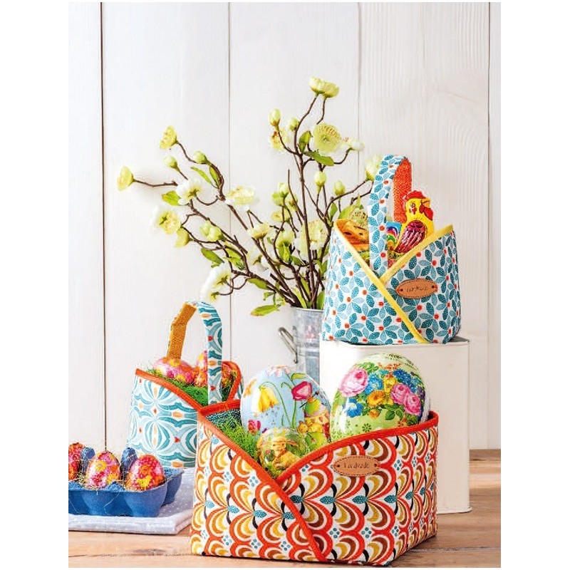 W kuchni duże szydełkowe jajo nie tylko służy do łapka do garnków, ale też jako podręczny magazynek akcesoriów. Kontynuując temat pojemnika-koszyczka, trzeba sprawdzić, dokąd udają się owieczki: rządkiem idą na dużym koszyczku, an face widać je na torebce z długim uchem. Ale jeśli nie lubisz szydełkować, możesz szybko uszyć koszyczki z kolorowych tkanin. To przedsięwzięcie ułatwi krótki kurs, a koszyczkami będziesz mogła się cieszyć przez cały rok.