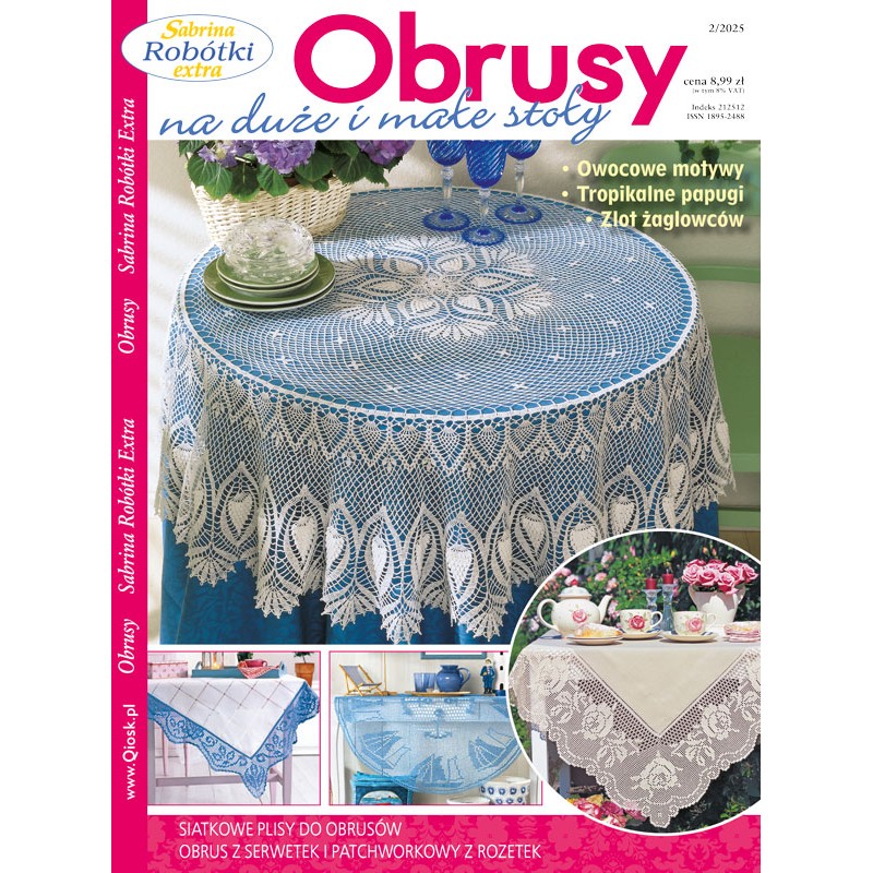 Duże jest piękne! Mamy duży stół – szukamy dużego obrusu. W numerze jest nawet model o średnicy 160 cm! Są też mniejsze propozycje na kawowy stolik. Znajdziecie wzory obrusów koronkowych i siatkowych; okrągłe, prostokątne, kwadratowe. Dzięki zamieszczonym wskazówkom, prawie każdy model można powiększyć – wystarczy zmiana szydełka i kordonka.