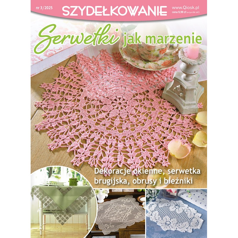 Szydełkowanie to kolekcja serwetek i bieżników, a także propozycje odświeżenia widoku na okno: raz może to być zazdrostka z konwaliami i łukowym brzegiem, innym razem trójwymiarowy kwiat konwalii rozpięty na okrągłej obręczy. Wśród motywów znajdziecie królewskie lilie (siatkowa kwadratowa serwetka i plisy), kwiaty na bieżnikach, patchwork z serwetek oraz serwetkę kwiatek zrobioną w technice brugijskiej. Mocne akcenty fioletowych serwetek ożywią stonowane dotychczas wnętrze, ale jeśli szukacie czegoś relaksującego, co można szydełkować w każdej wolnej chwili, to polecamy obrus z wstawką i bordiurą z motywów w kształcie filigranowych kwiatków.